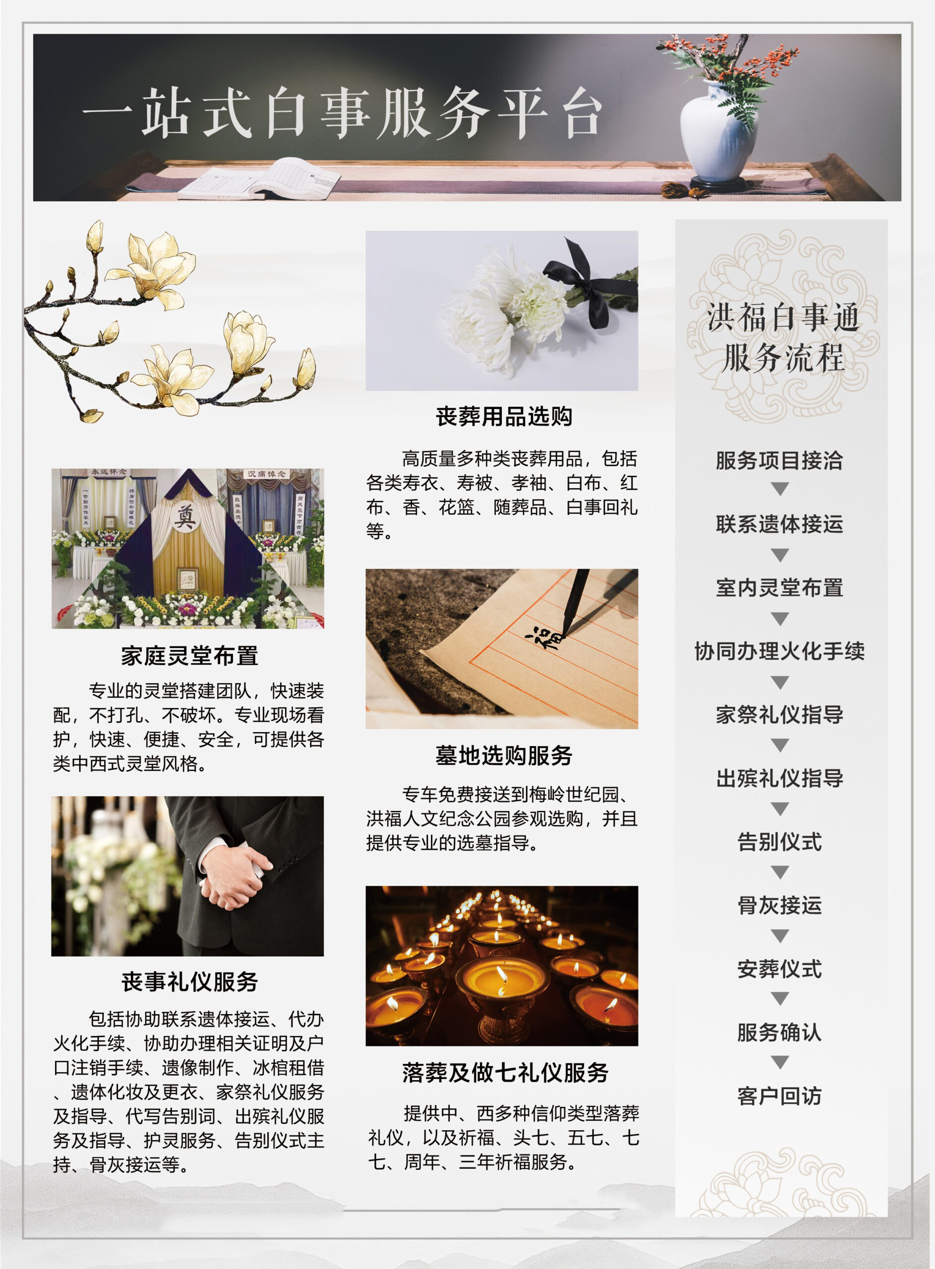 洪福白事通是南昌洪福人文纪念有限责任公司推出的综合性治丧服务平台,致力于为客户提供规范、文明、周到的丧事一站式服务。